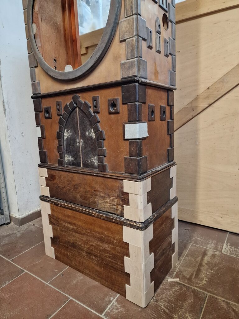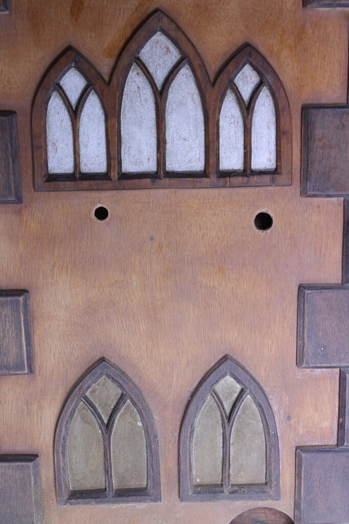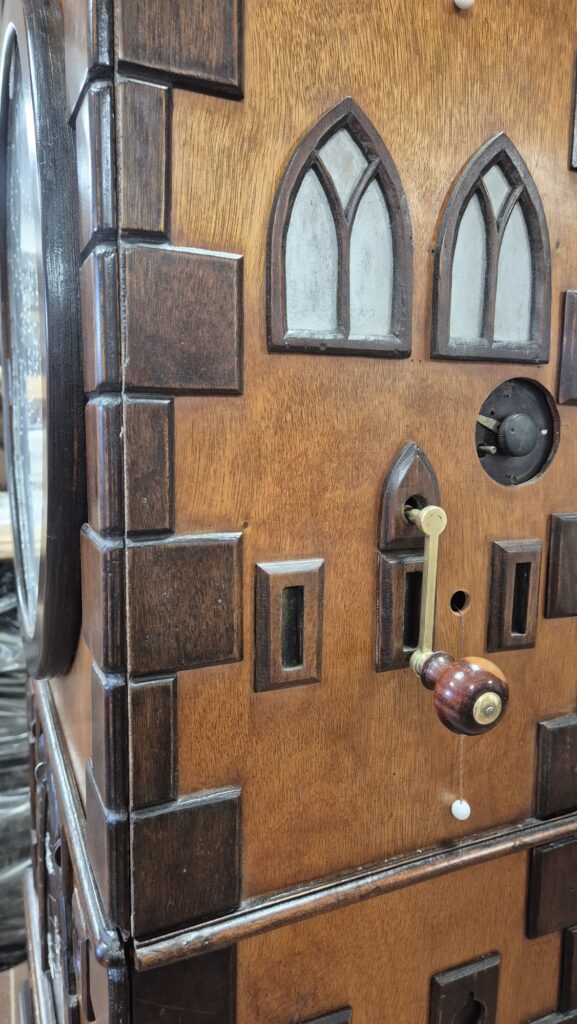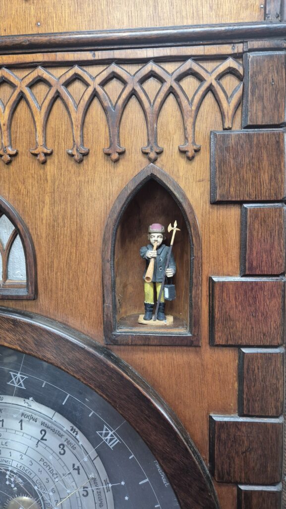 Unikátní amatérský orloj z počátku 20. století, který na první pohled zaujme svou výraznou architekturou inspirovanou gotikou. Bohatě zdobená skříň ukrývá mimořádně složitý hodinový mechanismus, jenž je výsledkem kreativního skládání různých dostupných součástí – včetně prvků ze starého gramofonu a dalších strojů